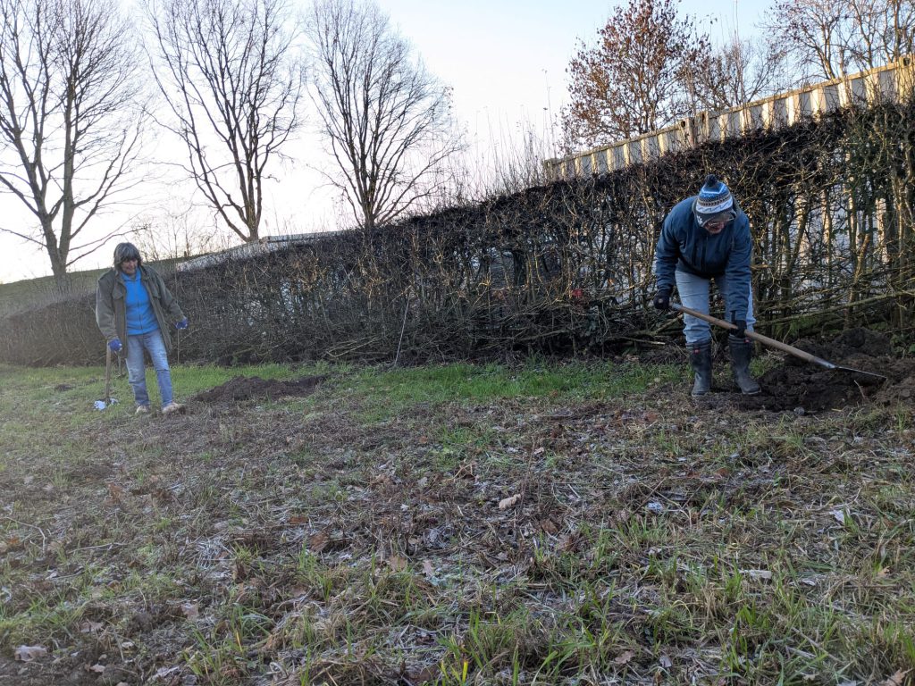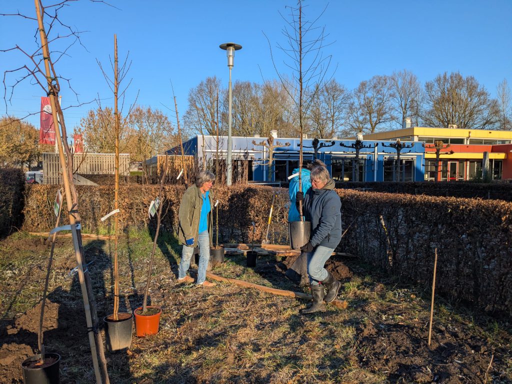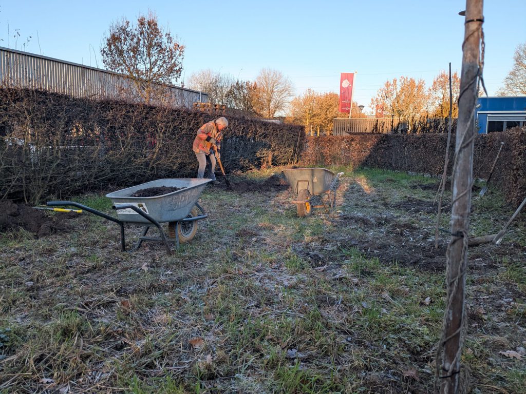 Die kregen -na wat passen & meten en gaten graven- meteen een mooi plekje. Ook onze eigen uiensoepboom en vijgenboom werden er geplant, op tijd voor het winterse weer in januari 2026.
