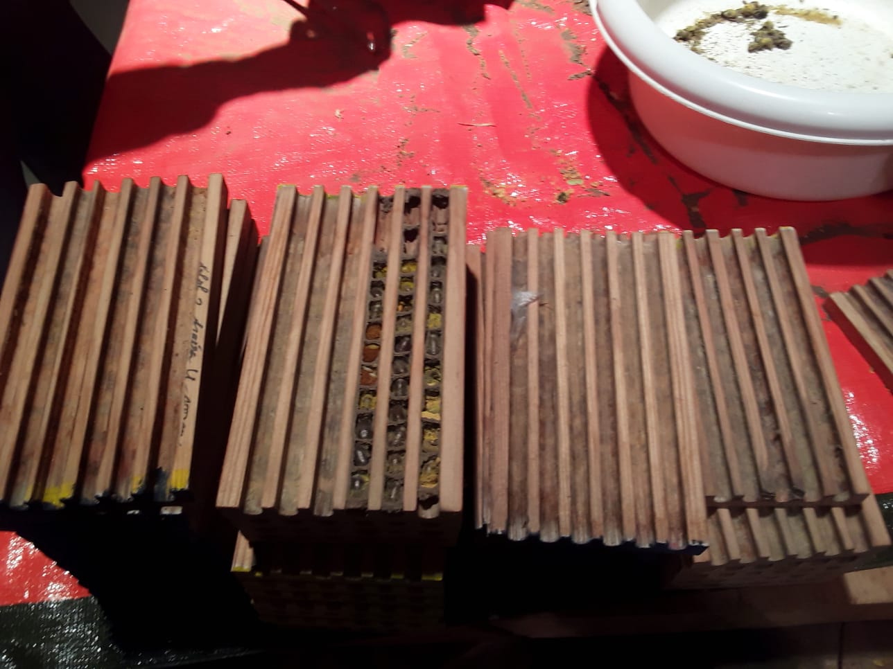 Voor het derde succesvolle jaar zijn we in De Veldschuur bijeengekomen om poppen van solitaire bijen uit de verzamelde nestkasten te oogsten. De afgelopen twee